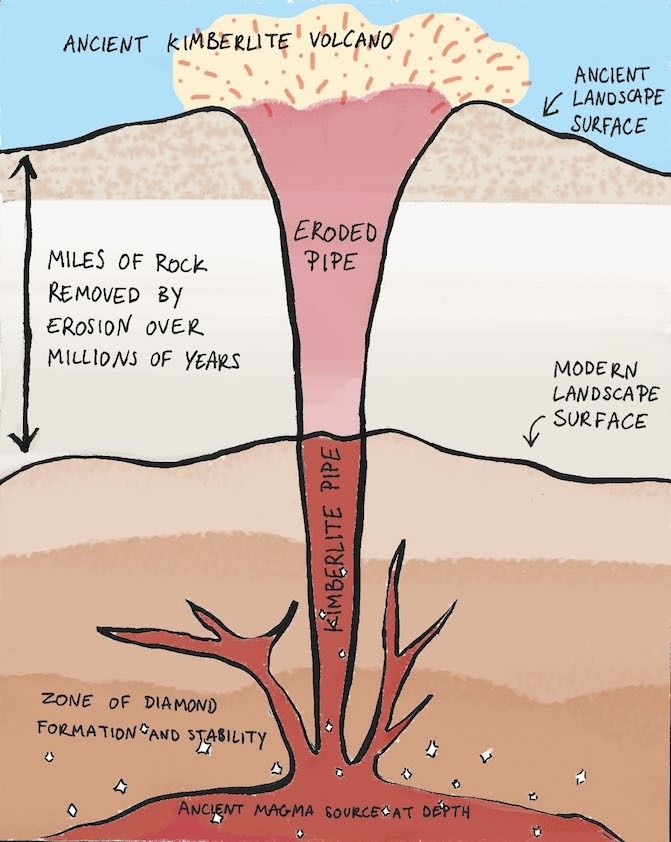 A deep vertical formation at the earth’s surface that results from a kimberlite or lamproite emplacement.