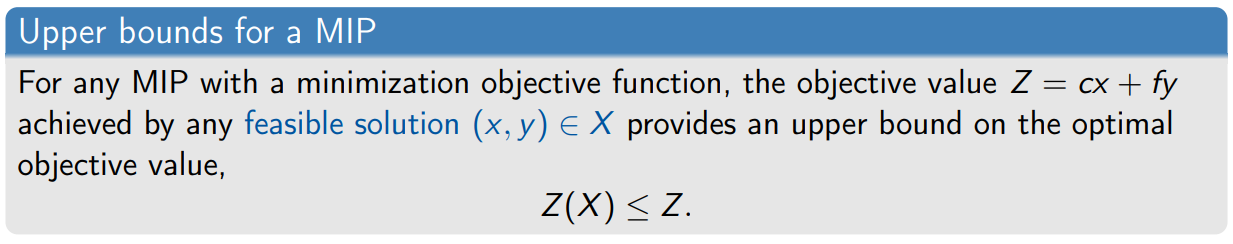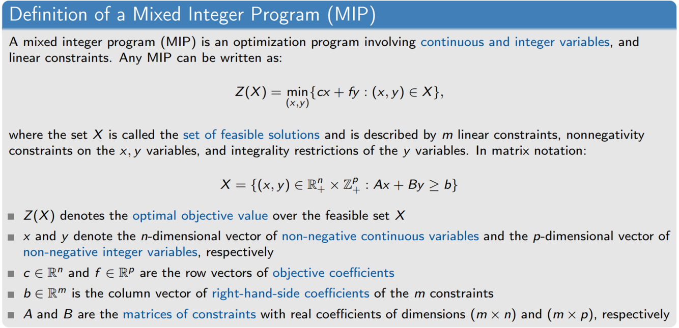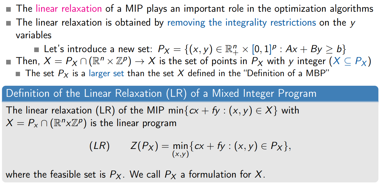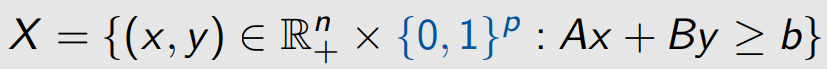 A mixed binary linear program (MBP), or mixed 0-1 program, is a MIP in which the integer variables y are further restricted to take binary values. This means that the feasible set X of a MBP is defined by