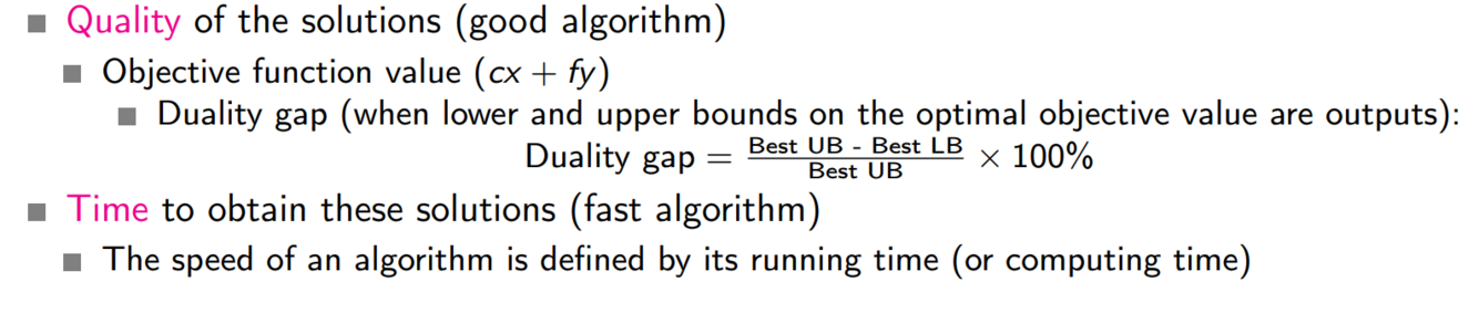 The running time of an algorithm on a particular instance is defined as the number of elementary operations performed. The elementary operations are the elementary arithmetic operations (+, −, ×, /) and the comparison of two numbers.