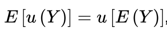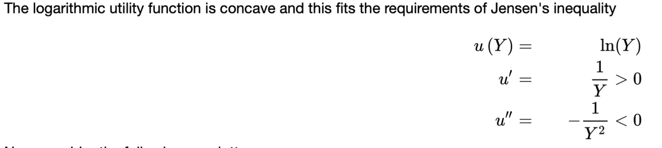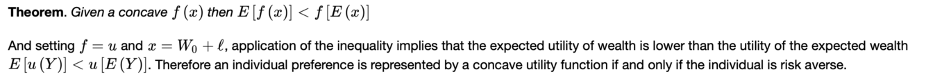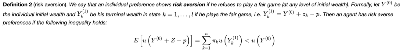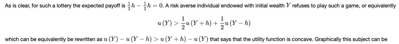 L’interpretazione è che l’utilità attesa della lotteria fair (cioè quindi l’utilità attesa della ricchezza finale dopo aver giocato la lotteria, Y1k) è inferiore all’utilità della ricchezza iniziale. Quindi la persona non gradisce partipare ad una lotteria fair e quindi è risk averse.