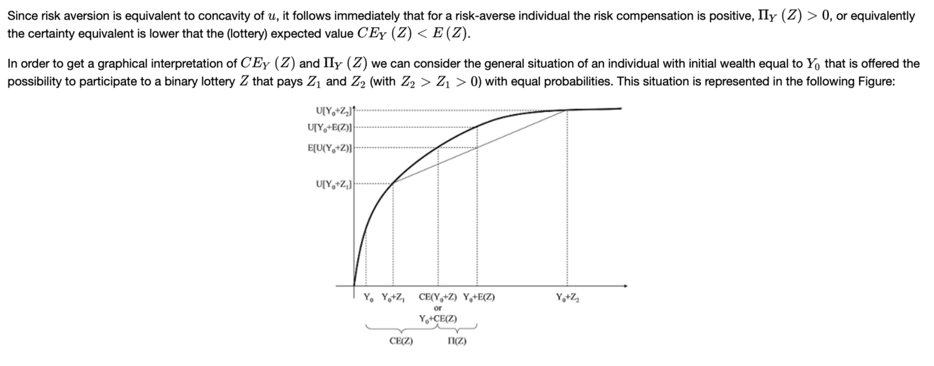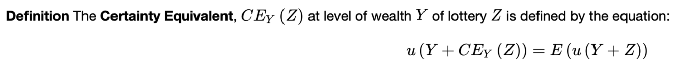 è una quantità da sommare alla ricchezza iniziale per cui l’utilià di non giocare è uguale all’utilità di giocare. è più piccolo del valore atteso della lotteria E(Z).