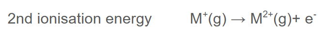Second ionisation energy of an element is the energy required to remove an electron from each singly charged positive ion in one mole of positive ions in the gaseous state.