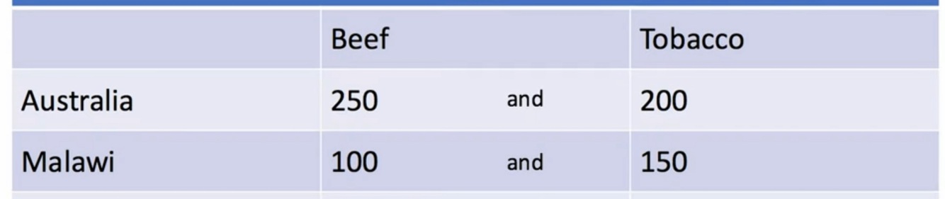 Australia have comparative advantage in producing beef. Malawi has comparative advantage in producing tobacco