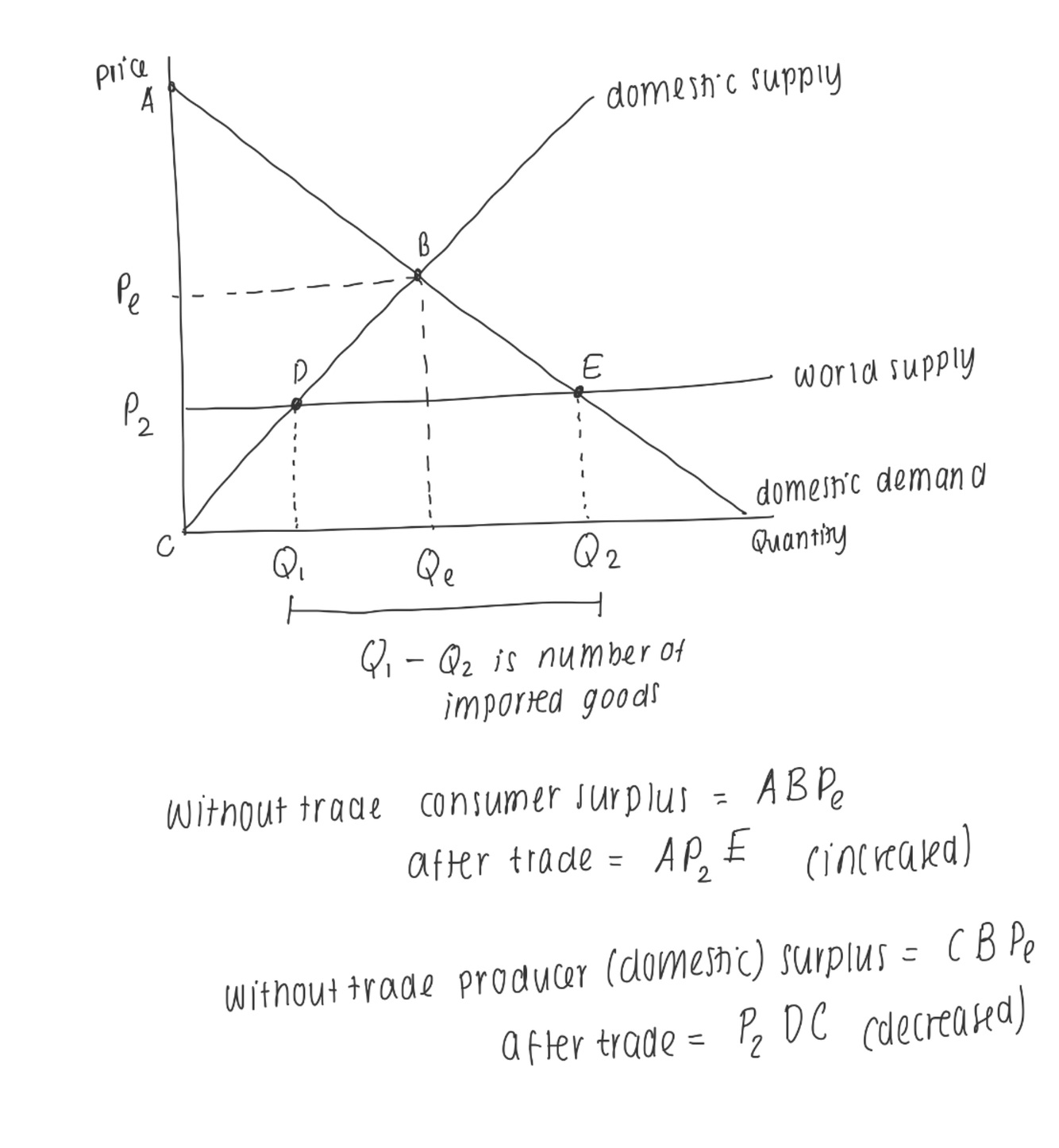 We assume that the good can be purchased at a lower world price because other countries may have lower production costs due to their comparative advantage. domestic production contracts from Qe to Q1 and domestoc demand extends from Qe to Q2 as it is now more affordable to consumer. One reuslt of this is that quanitity of imported goods becomes Q1-Q2