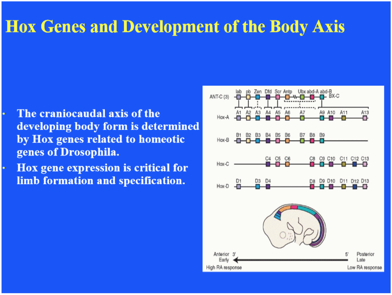 Hox genes are critical for establishing limb formation and specification. Hox genes determine where limbs will form along the length of the developing fetus. Genes with the same number, but positioned on different chromosomes, form a paralogous group.Expression of genes is in a cranial-to-caudal direction from the 3’ (expressed early) to the 5’ (expressed later) end as indicated in the fly and human embryo diagrams. Retinoic acid (RA) modulates expression of these genes, with those at the 3’ end being more responsive to the compound.