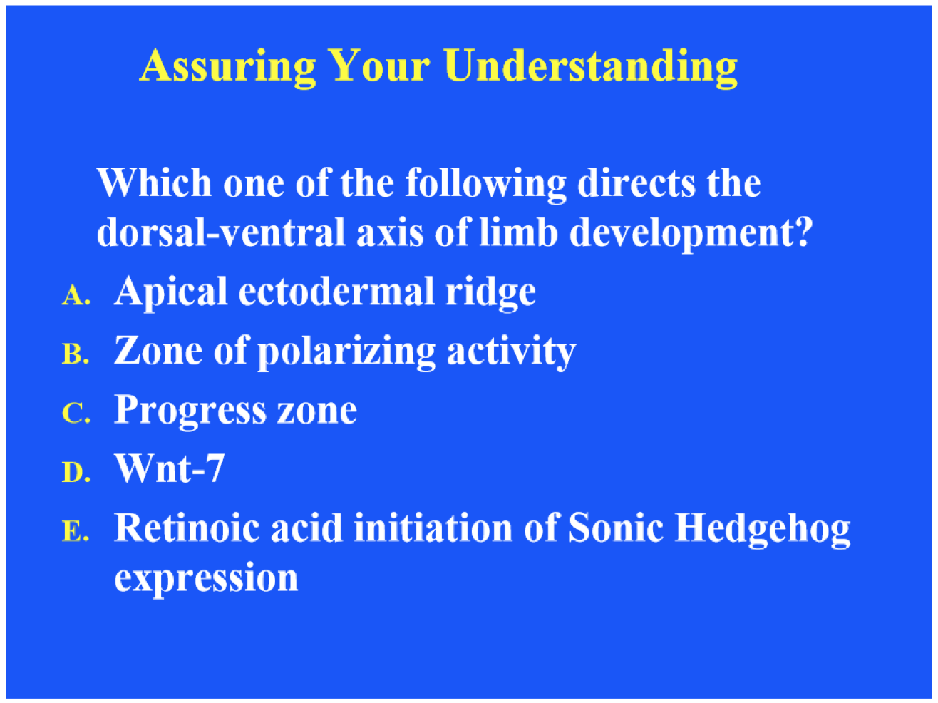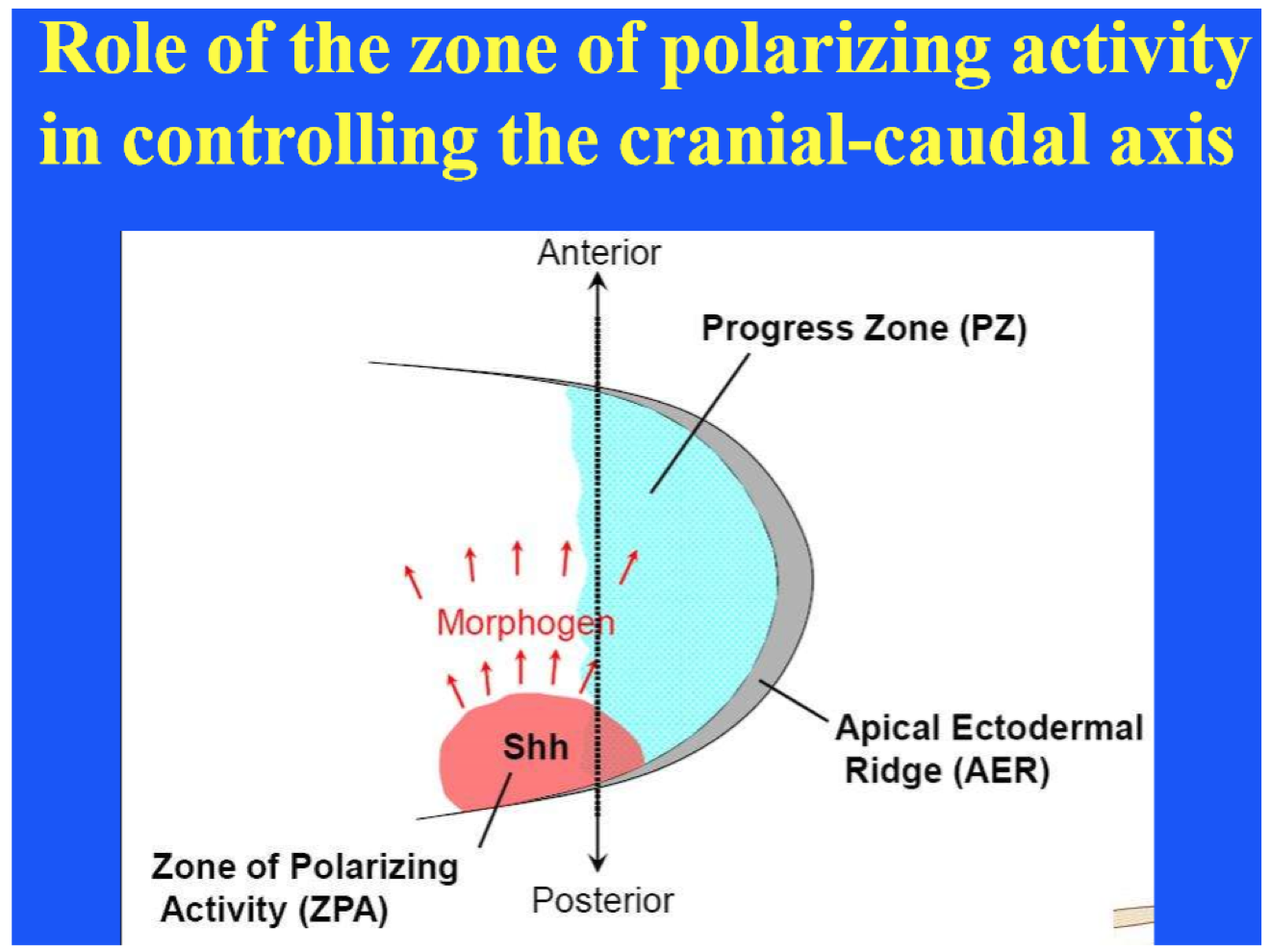 Retinoic acid and Sonic hedgehog (Shh) are morphogens—their concentration varies from high to low across the limb establishing the cranial-caudal (anteroposterior) axis. ZPA organizes anteroposterior axis and produces retinoic acid which induces Sonic hedgehog (Shh). Shh defines the ZPA. Differentiation of the digits is dependent on concentration of morphogen and duration of exposure.