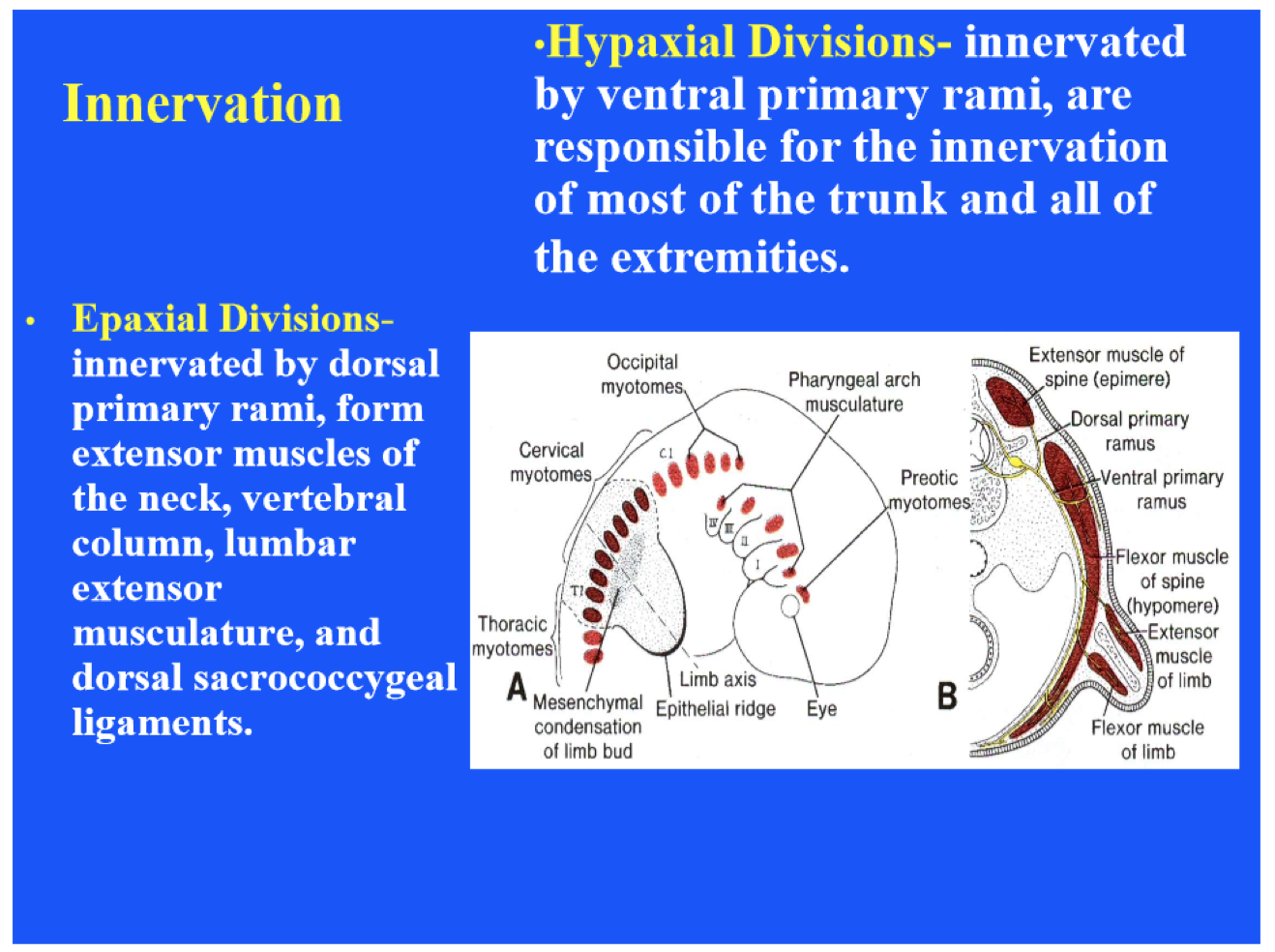 Myotomes divide into 2 parts. The epimere will form the dorsal extensors of the spine and is innervated by the dorsal primary rami. The hypomere is innervated by the ventral primary rami.