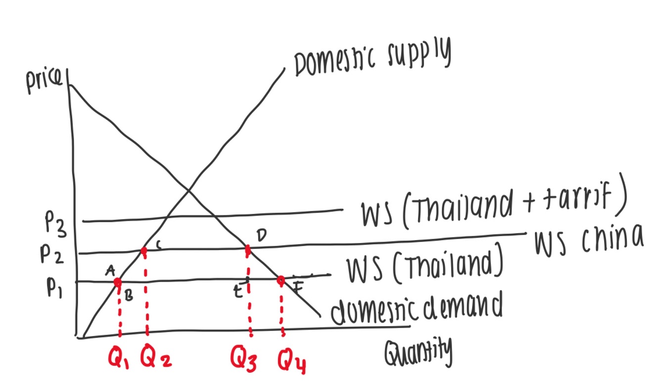 As a result of joining a customs union, the country must adopt the common external tariff, which increases the price of imports from P1 to P3. This makes imports from Thailand, previously the most competitive supplier, less attractive due to the higher price. Consequently, the next best supplier becomes China, offering the good at P2. This shift represents trade diversion, as the country now sources imports from a less efficient producer within the customs union or at a higher cost compared to the previous global supplier.