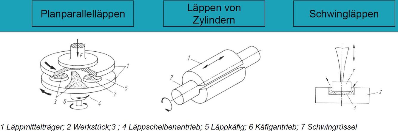 Oberflächenmaterial wird abgetragen durch Rollbewegung Ritzen (bei temporärer verankerung mit der Läppscheibe) der Schneidkörner.