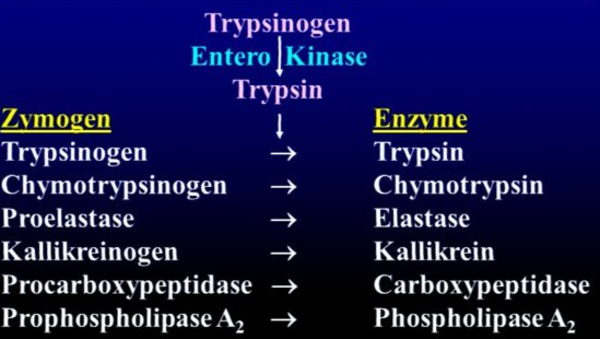 Recognize that acinar cells produce trypsinogen which is converted to trypsin by enterokinase in small intestine