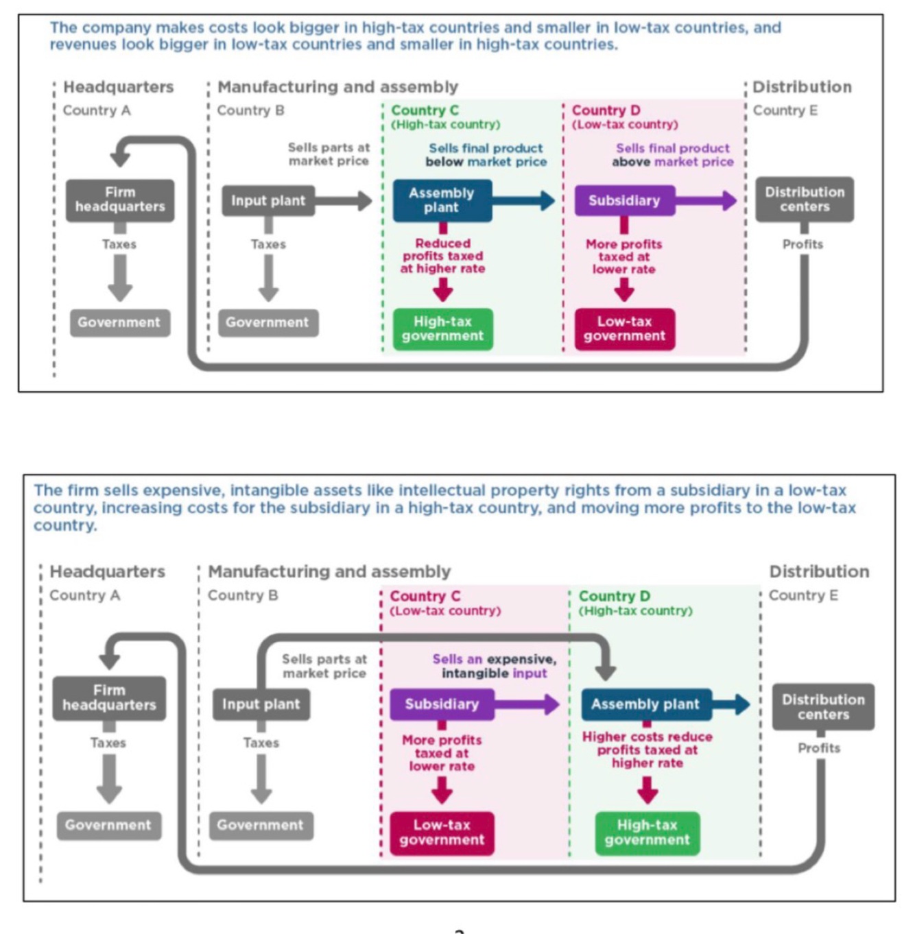 A) transfer pricing: this is where a MNC subsidiary produced a good or service in a high tax country, transfer it to a different country at an artificially low price, where it is used to produce another good or service. This makes it look like the subsidiary has not made much profit in the high tax country. At the same time a larger profit is made in the low tax country