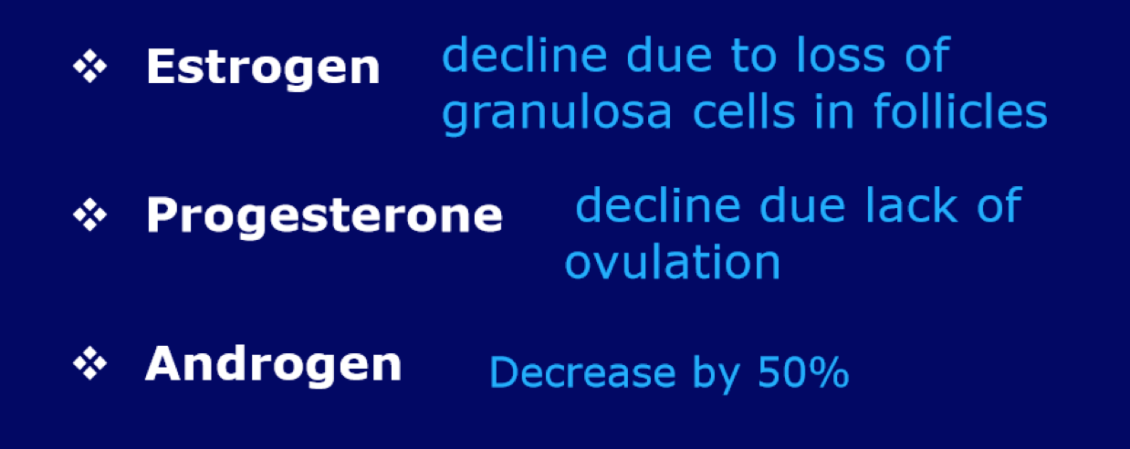 What happens to estrogen, progesterone and androgen levels after menopause? Why?