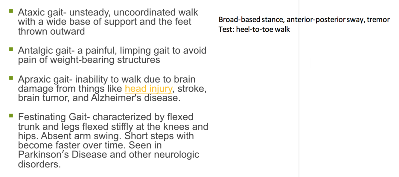 Describe these gaits: ataxic, atalgic, apraxic, festinating