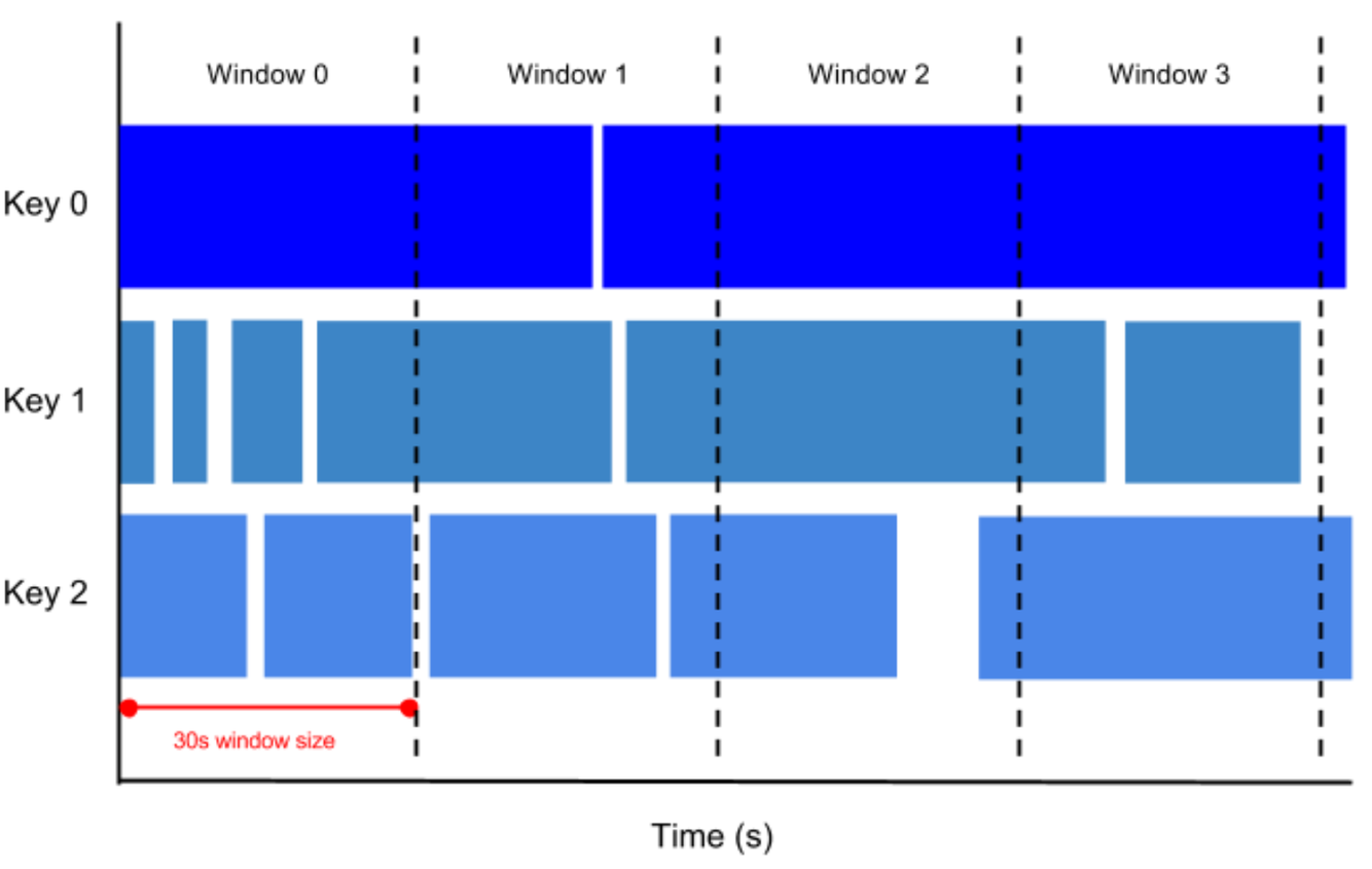 For example, if you set to a thirty-second tumbling window, the elements with timestamp values [0:00:00-0:00:30) are in the first window. Elements with timestamp values [0:00:30-0:01:00) are in the second window.