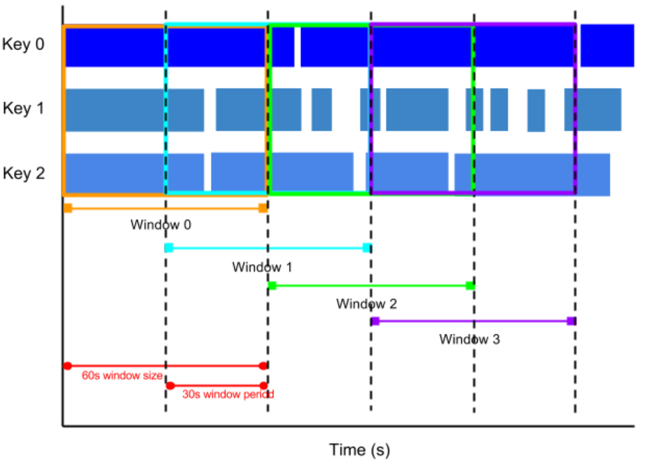 For example, a hopping window can start every ten seconds and capture one minute of data and the window. The frequency with which hopping windows begin is called the period. This example has a one-minute window and thirty-second period.