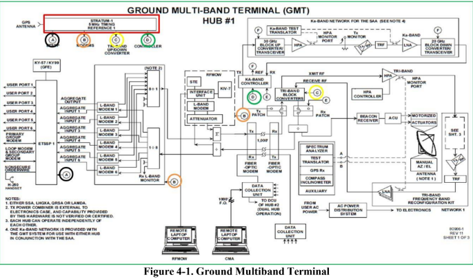 The ETSSP (), data modems (), Replacement Frequency Modulated Order Wire (RFMOW) modem (), the block up/down converters () and the KA-Band controller (_) all receive timing from the Stratum-1 timing source via the four (4) 5 MHz outputs.