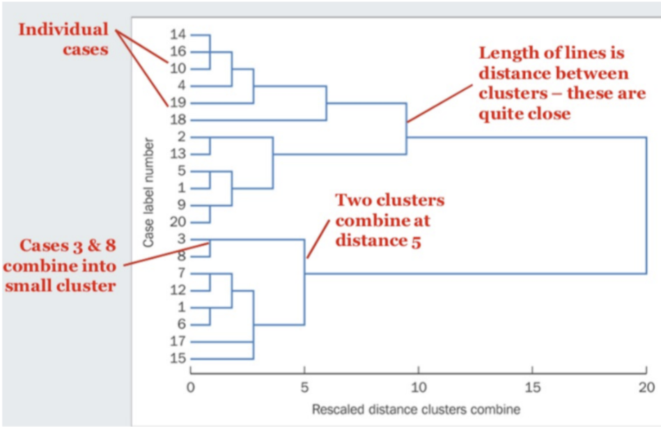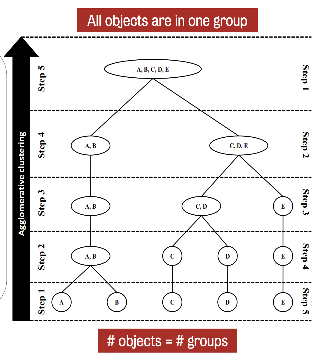 It starts with each object as its own cluster at the bottom, then merges clusters step-by-step.