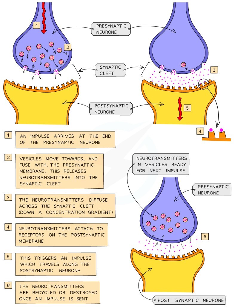 Chemicals called neurotransmitters (such as dopamine and serotonin) are released into the synaptic cleft and diffuse across it (down a concentration gradient)