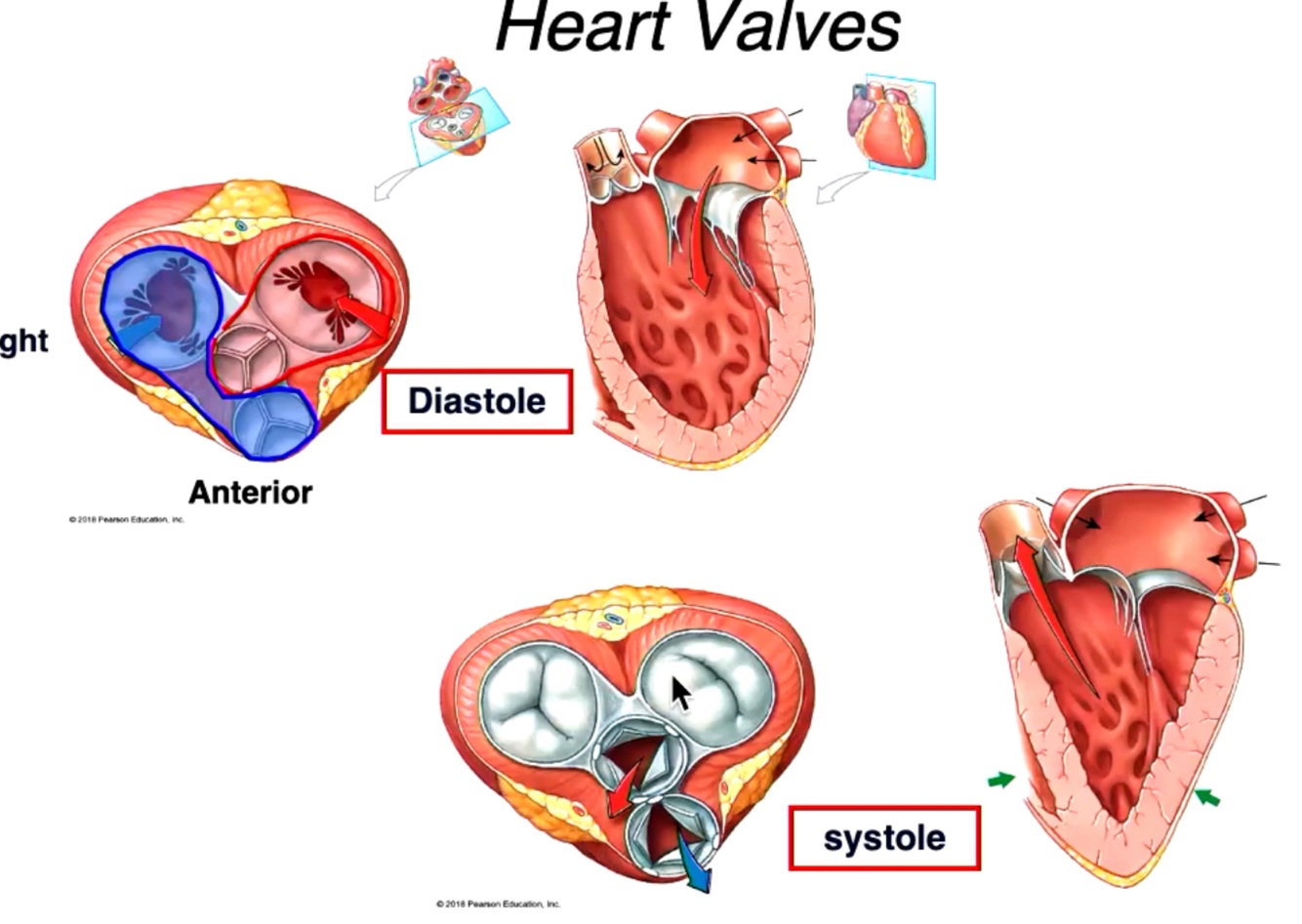 Location of the 4 valves and how they look in sysitle and diastole