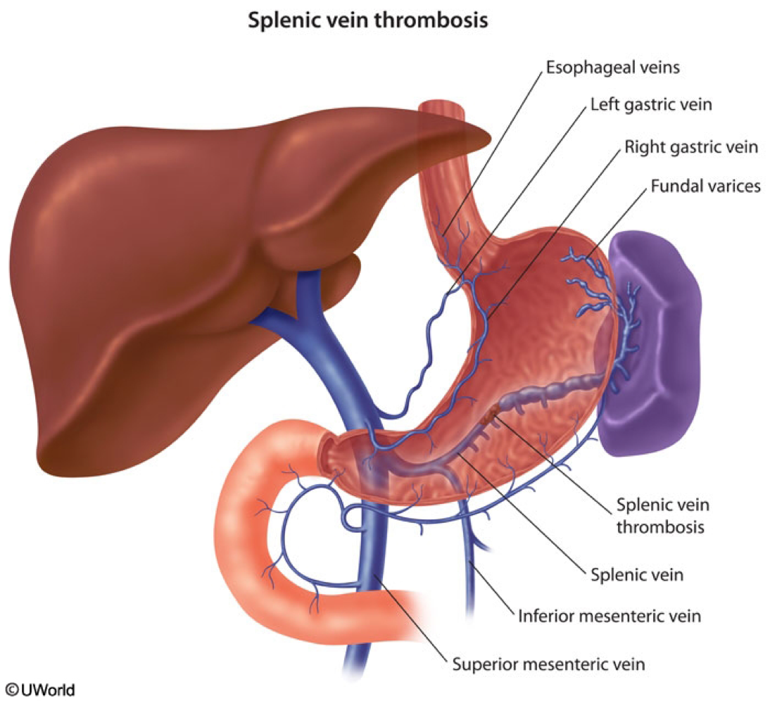 Splenic vein thrombosis (often due to pancreatitis, pancreatic cancer, or abdominal tumors - splenic vein runs posterior to pancreas)
