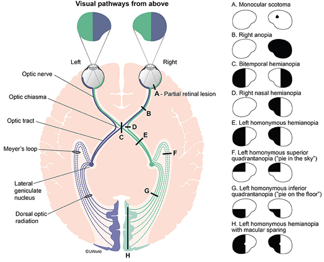 What are the different defects that cause homonymous hemianopia with macular involvment vs homonymous hemianopia with macular sparing