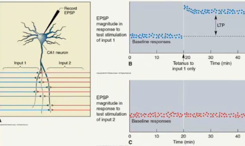 Long term potentiation (e.g. CA3 input to CA1 neuron)