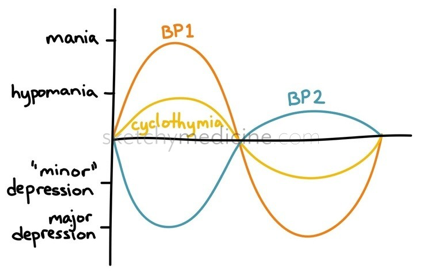 Describe the difference between Bipolar I, Bipolar II, and Cyclothymic disorder