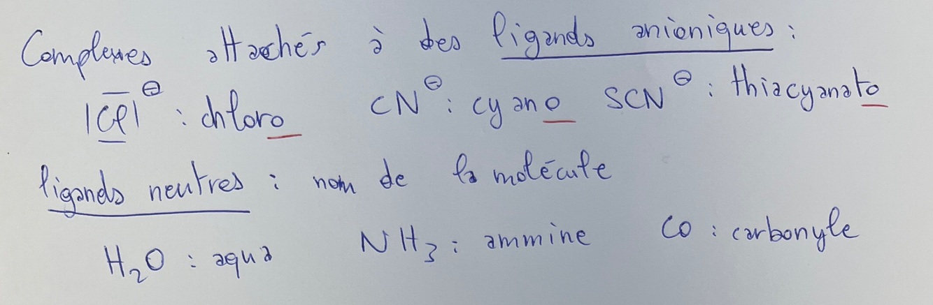 Donne les nomenclatures si le complexe est lié à des ligands anioniques ? Neutres ? Donne des exemples à chaque fois