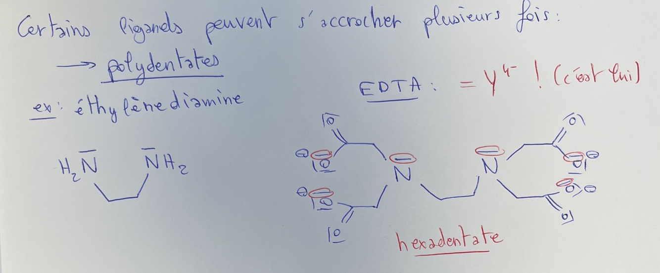 Quelles particularités ont certains ligands ? Donne un exemple. Écris la formule de Lewis de EDTA (éthylènediaminetetracetate), comment l’appelle t on généralement ? comment le qualifier ?