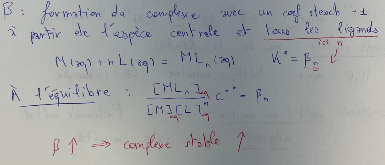 Donne la définition de β, fais l’équation de réaction canonique et écris sa constante de réaction. Qu’à t on a l’équilibre ? Que signifie un β grand ?