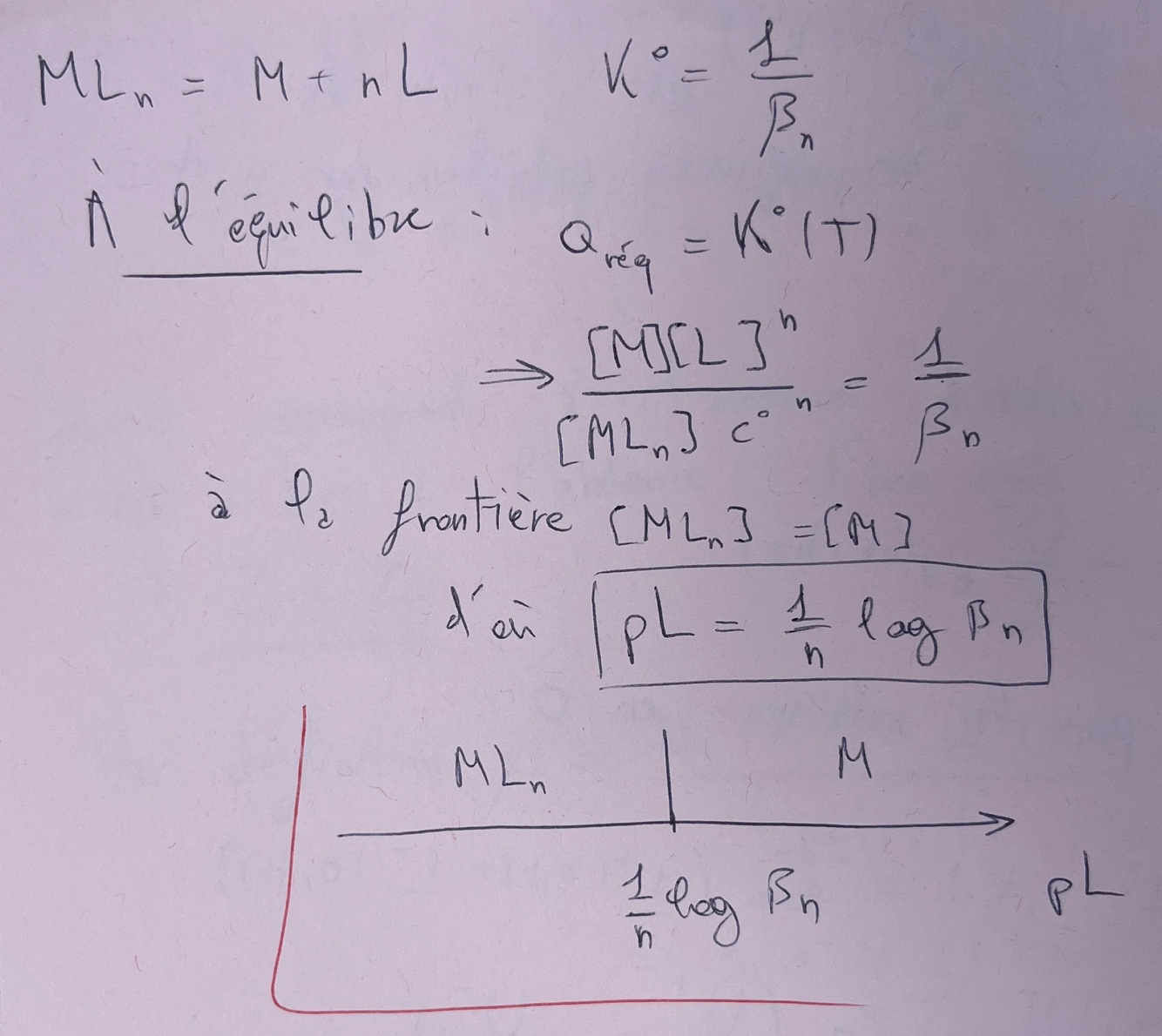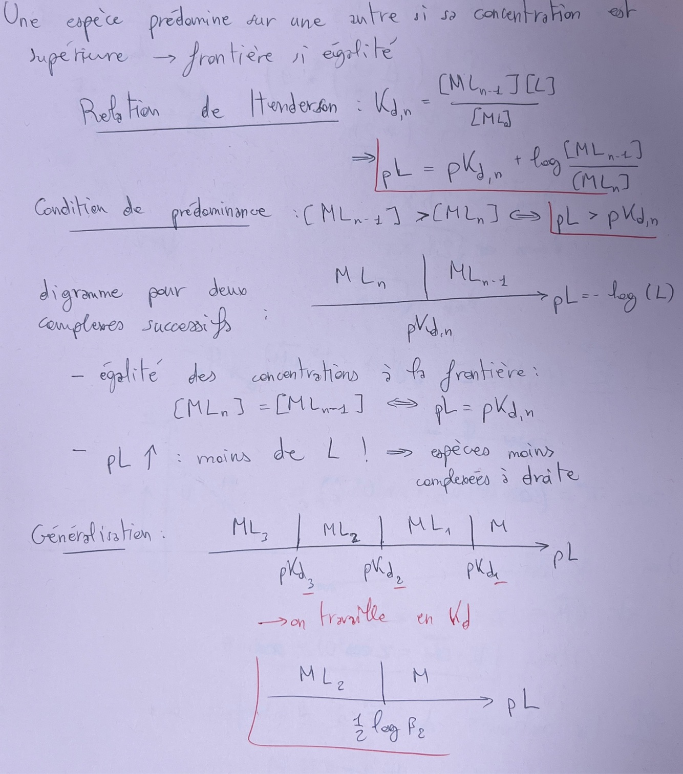 Qu’appelle t on une espèce prédominante ? Qu’y a t il a la frontière ? Donne la relation qui nous permet de tout démontrer, déduis en la condition de prédominance et trace le diagramme pour deux complexes successifs ; deux trucs à savoir sur le diagramme ? Généralise le diagramme pour un complexe à plusieurs ligands. Trace un diagramme pour M qui devient ML₂