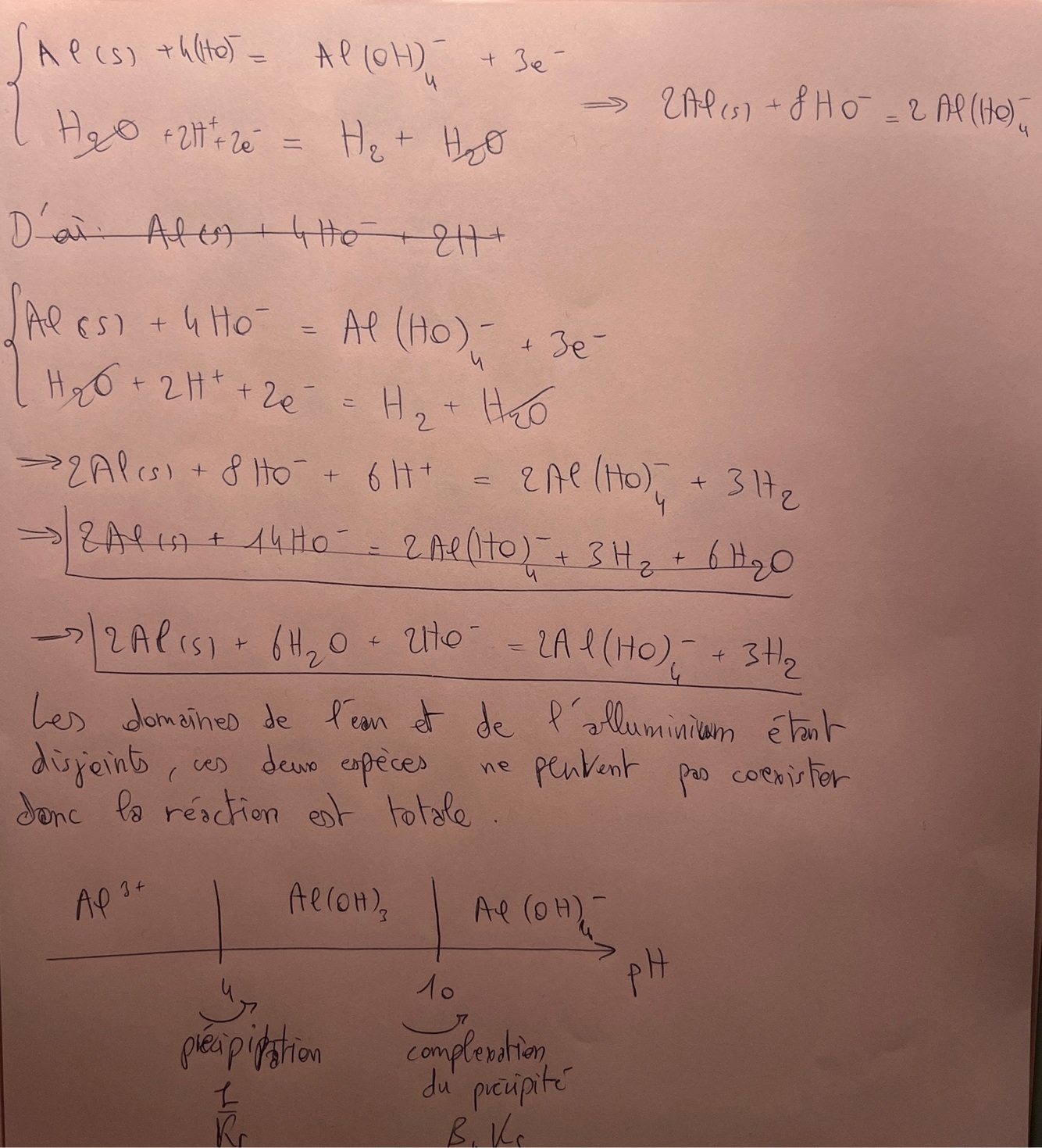On dissout une canette en aluminium en la plongeant dans de la soude concentrée, écrire l’équation de la réaction et justifier son caractère total. On part d’une solution de Al³⁺ et on ajoute progressivement de la soude concentrée. Écrire les équations de réaction et donneur leurs constantes