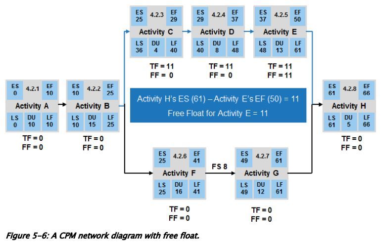 Is the amount of time an activity can be delayed without delaying the ES of any activity that immediately follows it. It allows flexibility of the start or finish time within that activity only. If there is a string of activities with float, free float will be available only for the activity at the end of the string.