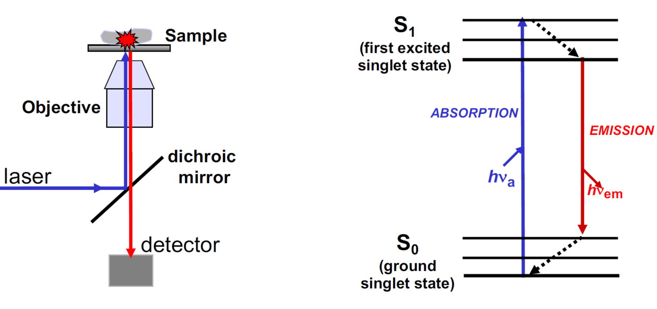 A doughnut shaped STED beam surrounds the laser beam. The STED beam has a longer wavelength than the excitation beam. This means the STED beam causes stimulated emission, suppressing flurescence around the imaging point