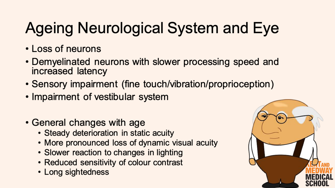 What neurological changes in older age can be associated with increased risk of falls?