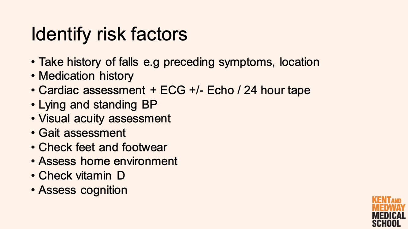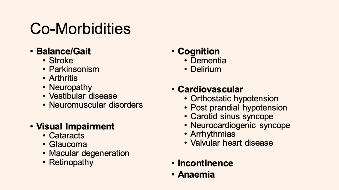 What areas of co-morbidity should you be aware of when assessing inc risk of falls?