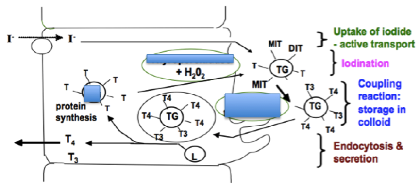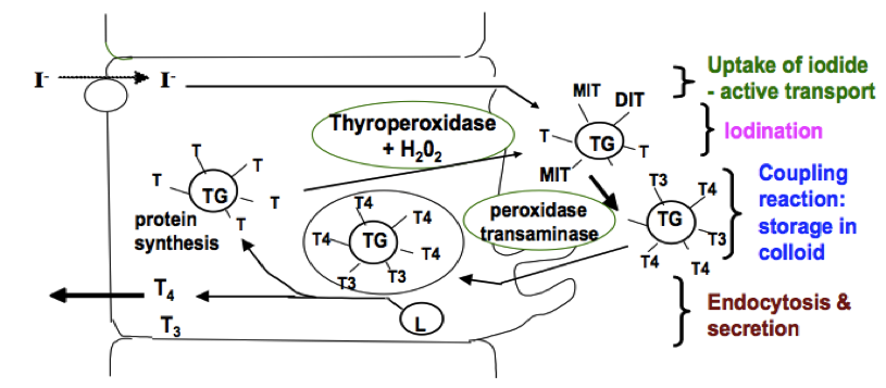 Main actors are thyroperoxidase (iodination of tyrosine) and peroxide transaminase (coupling of mono/diiodotyrosine)