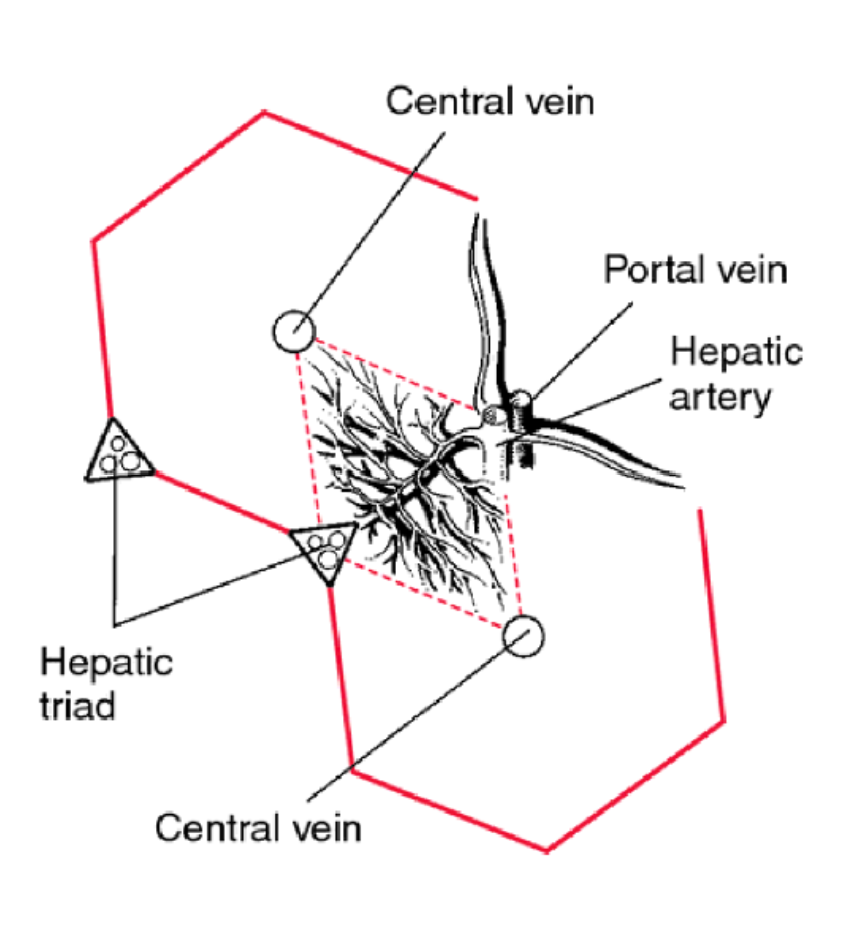 -structure: a hexagonal structure of hepatocytes surrounding a central vein