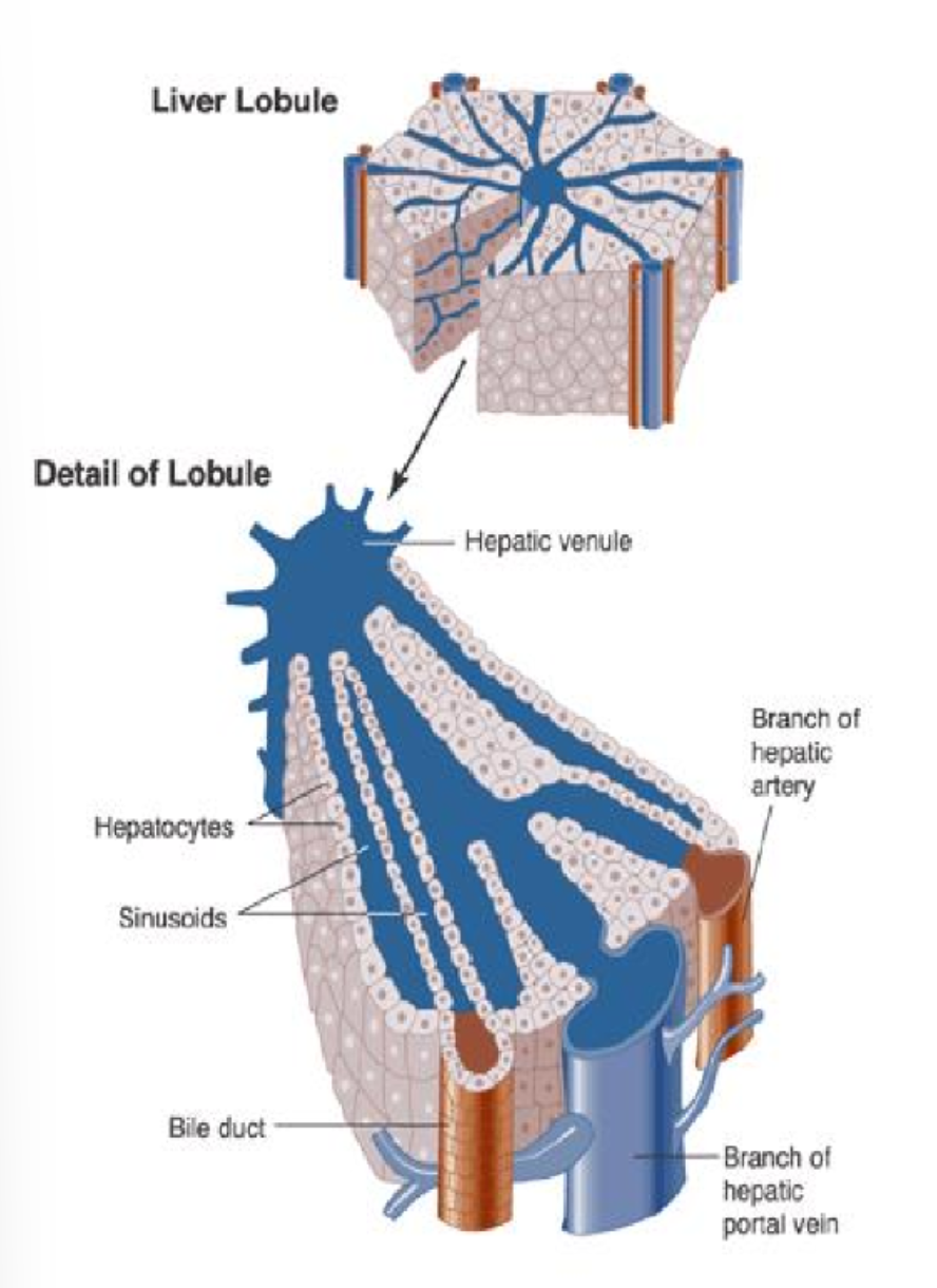 -blood flows through the sinusoids and empties into the central vein of each lobule