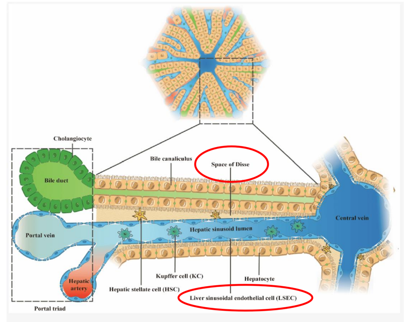 -microvilli of hepatocytes extend into this space, allowing proteins and other plasma components from the sinusoids to be absorbed by the hepatocytes