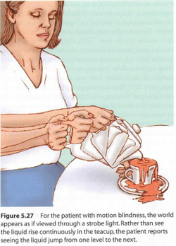 Motion blindness - a patient cannot perceive motion in their visual field, despite being able to perceive stationary objects without issue. They see the world like a series of snapshots.