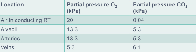 What is the pO2 and pCO2 in arteries, veins, alveoli and conducting airways?