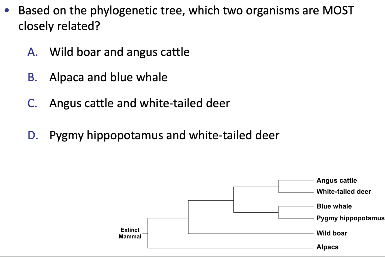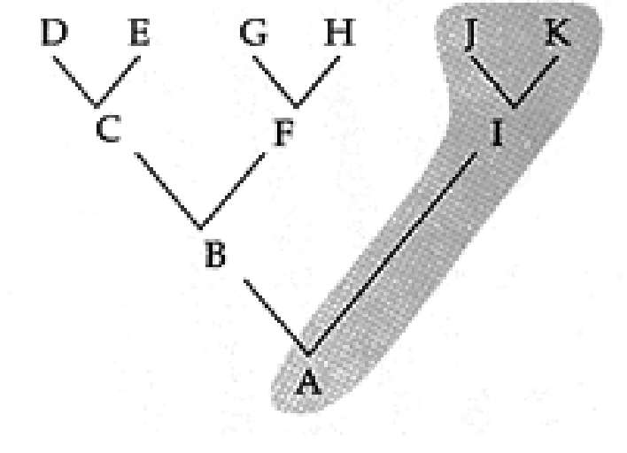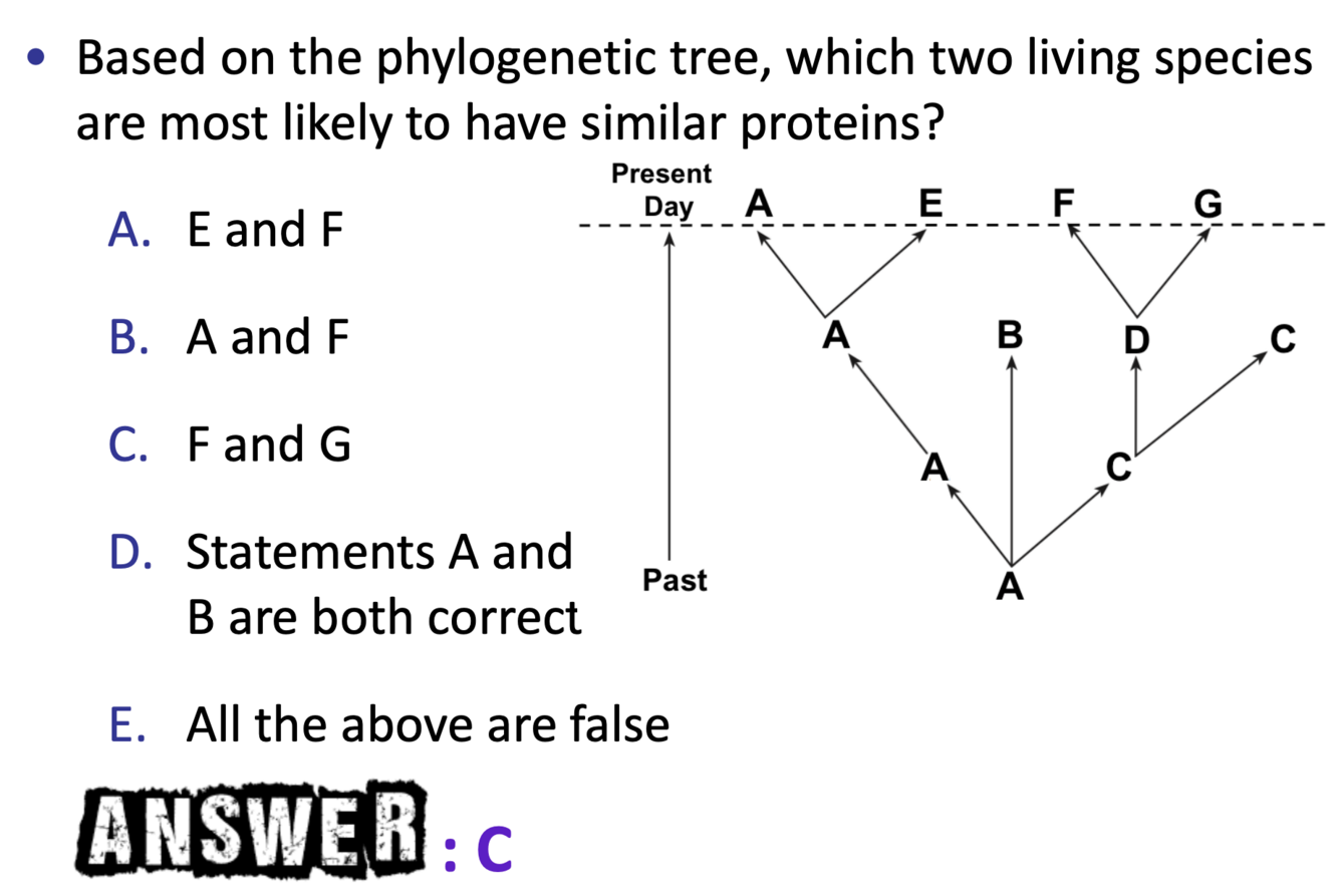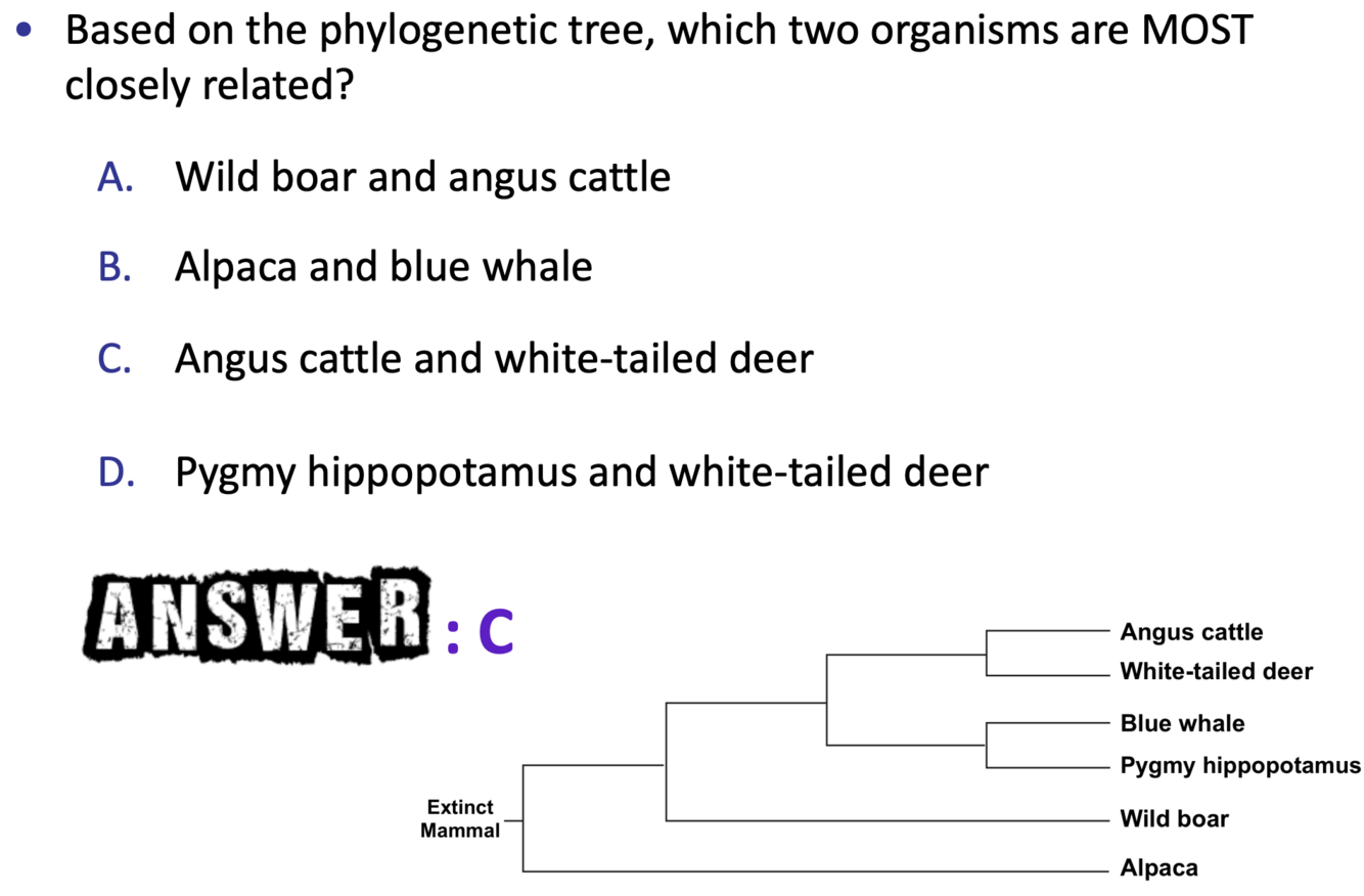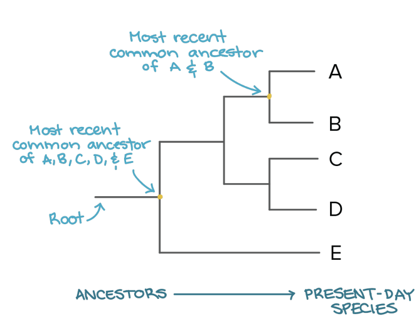 In a phylogenetic tree, the relatedness of two groups has a specific meaning: