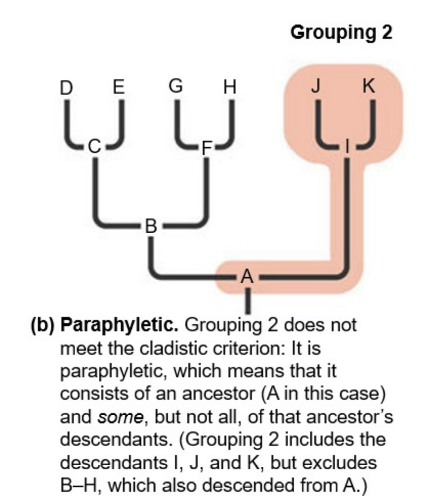 A paraphyletic grouping consists of an ancestral species and some, but not all, of its descendants