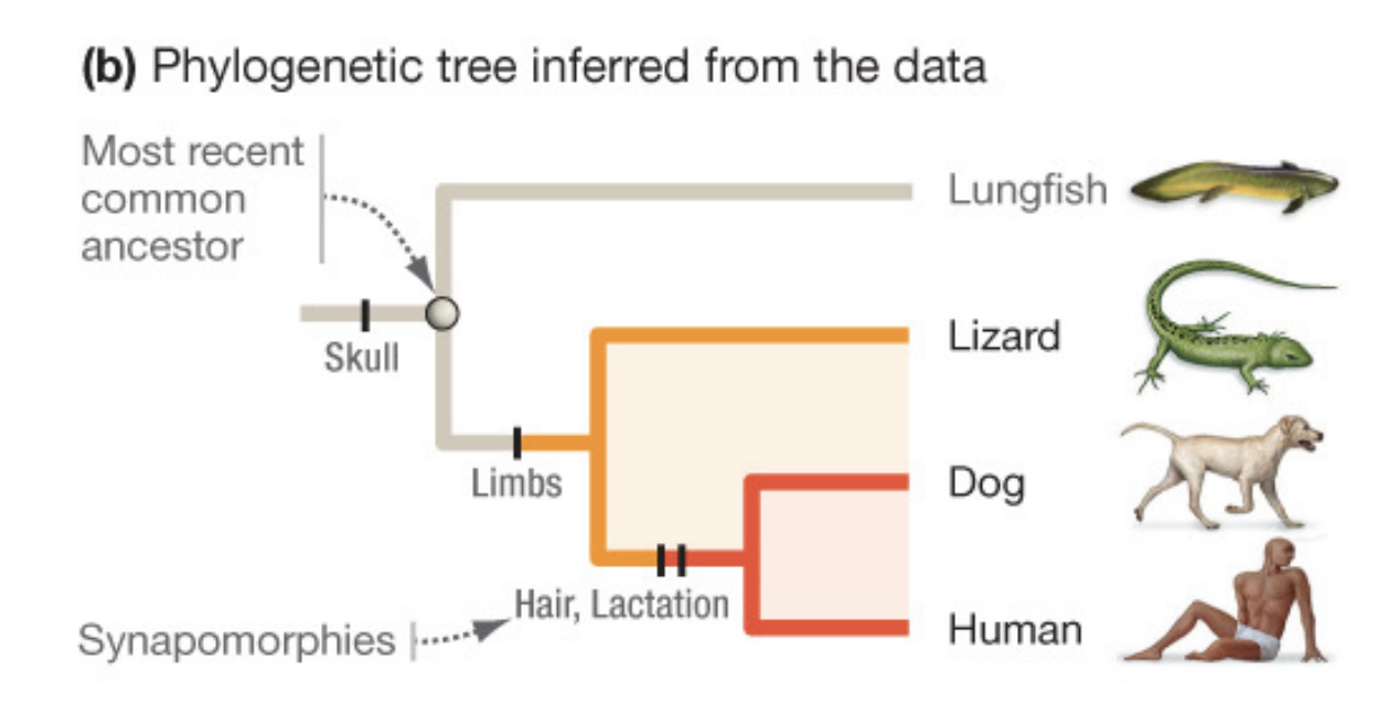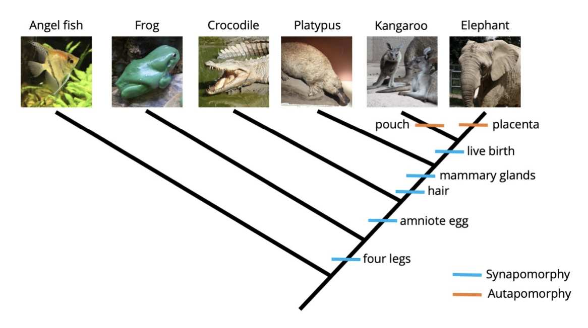 A synapomorphy is a shared, derived trait common between descendants (two or more groups) and their most recent common ancestor (note – this trait is missing in more distant ancestors)