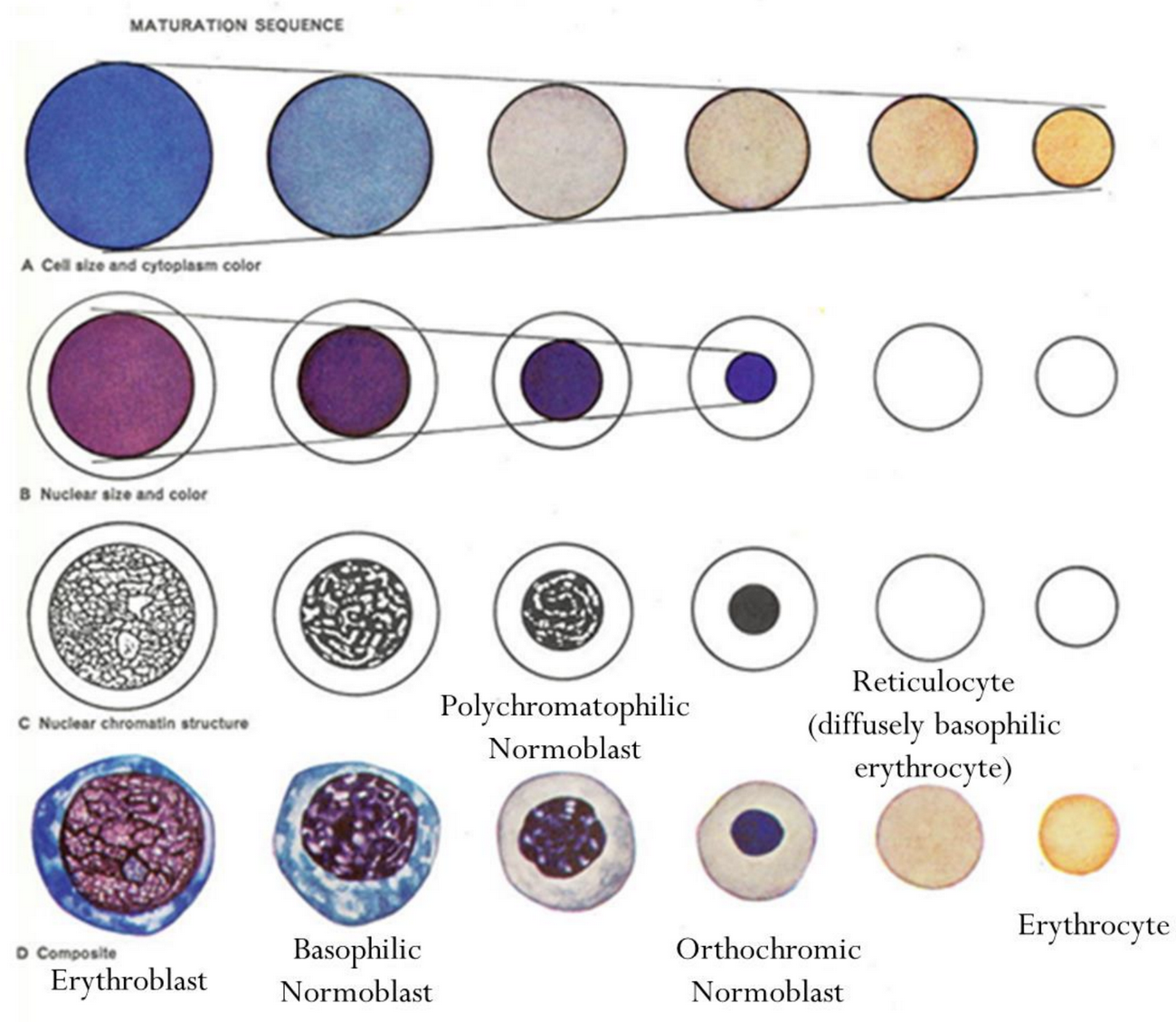 Cytoplasm (increasing eosinophilia = hemoglobin)