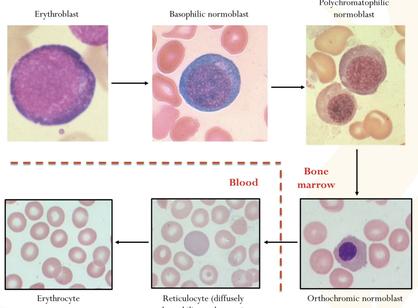 red cell precursors in the bone marrow with an iron stain