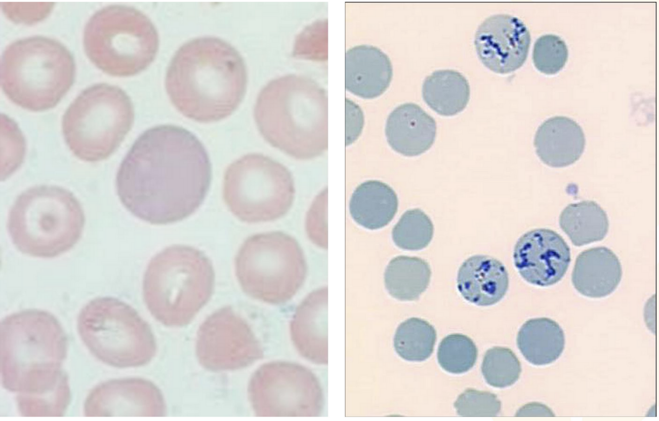 iron (blue) would usually be incorporated into the porphyrin ring but is blocked creating ringed sideroblasts