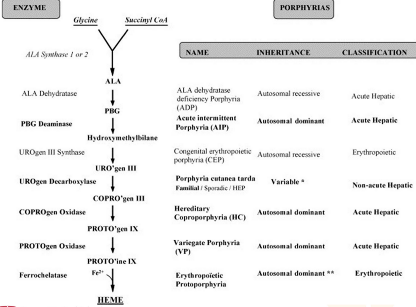 synthetic pathway for heme synthesis (simplified version) and heme synthesis - clinical correlation, porphyrias