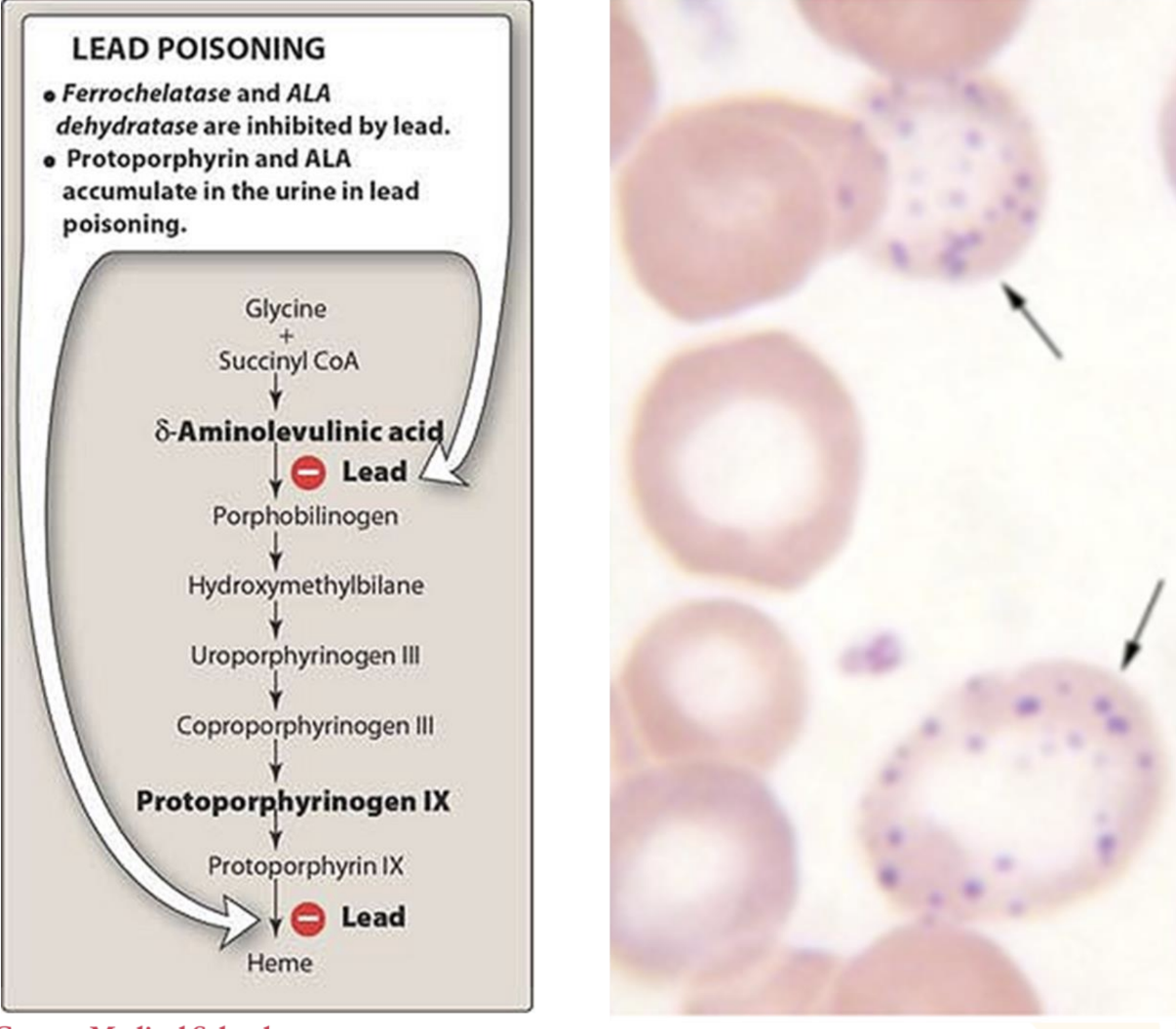 heme synthesis - clinical correlation, lead poisoning